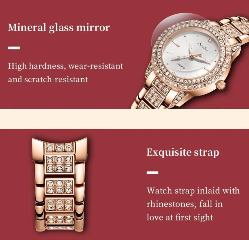 Chaque détail compte, du miroir en verre minéral résistant et résistant aux rayures, au bracelet exquis incrusté de strass. Chaque composant de cette montre de luxe femme pas chère vous fera tomber sous son charme au premier regard.