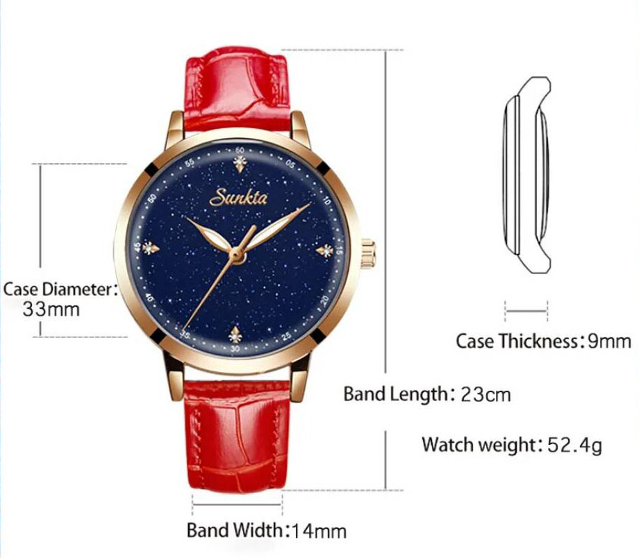 Featuring a 33mm case diameter, a 9mm case thickness, and a 23cm strap length, the SUNKTA Dahlia elegantly combines comfort and refinement. With a lightweight 52.4g and a 14mm band width, this affordable luxury women's watch will be the perfect accessory for any occasion.