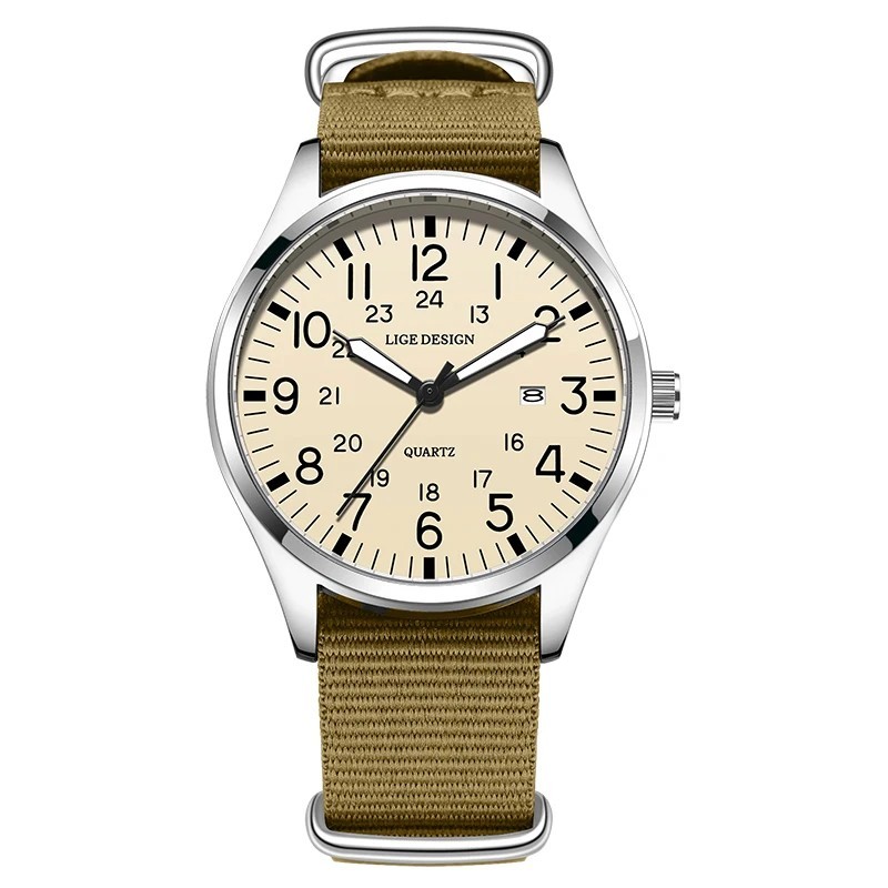 The metal case measures 41 mm in diameter and 11 mm thick, with a strap 20 mm wide and 230 mm long. The quartz movement, mineral glass, and nylon strap ensure durability and comfort, while the 30 m water resistance protects the watch for everyday use.