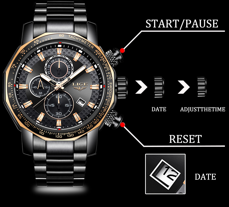This watch features a precise chronograph and a date display, perfect for everyday or sporty use. The side buttons allow simple and quick adjustment of the various functions, ensuring an optimal user experience.
