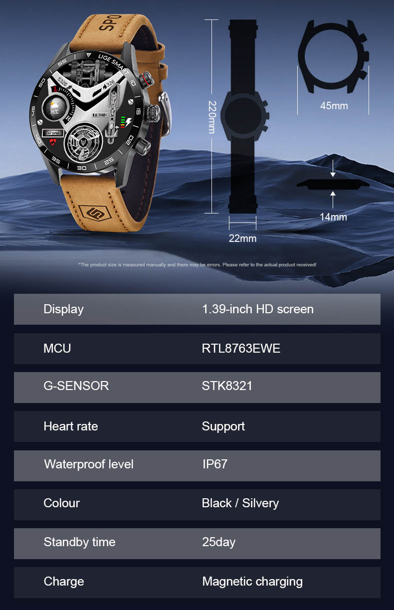 This smartwatch features a 1.39-inch HD screen, a G-SENSOR sensor, IP67 water resistance, and a comfortable strap. To discover more affordable smartwatches, explore our selection. Battery life, magnetic charging, and compatibility with different styles make it a reliable and versatile accessory.