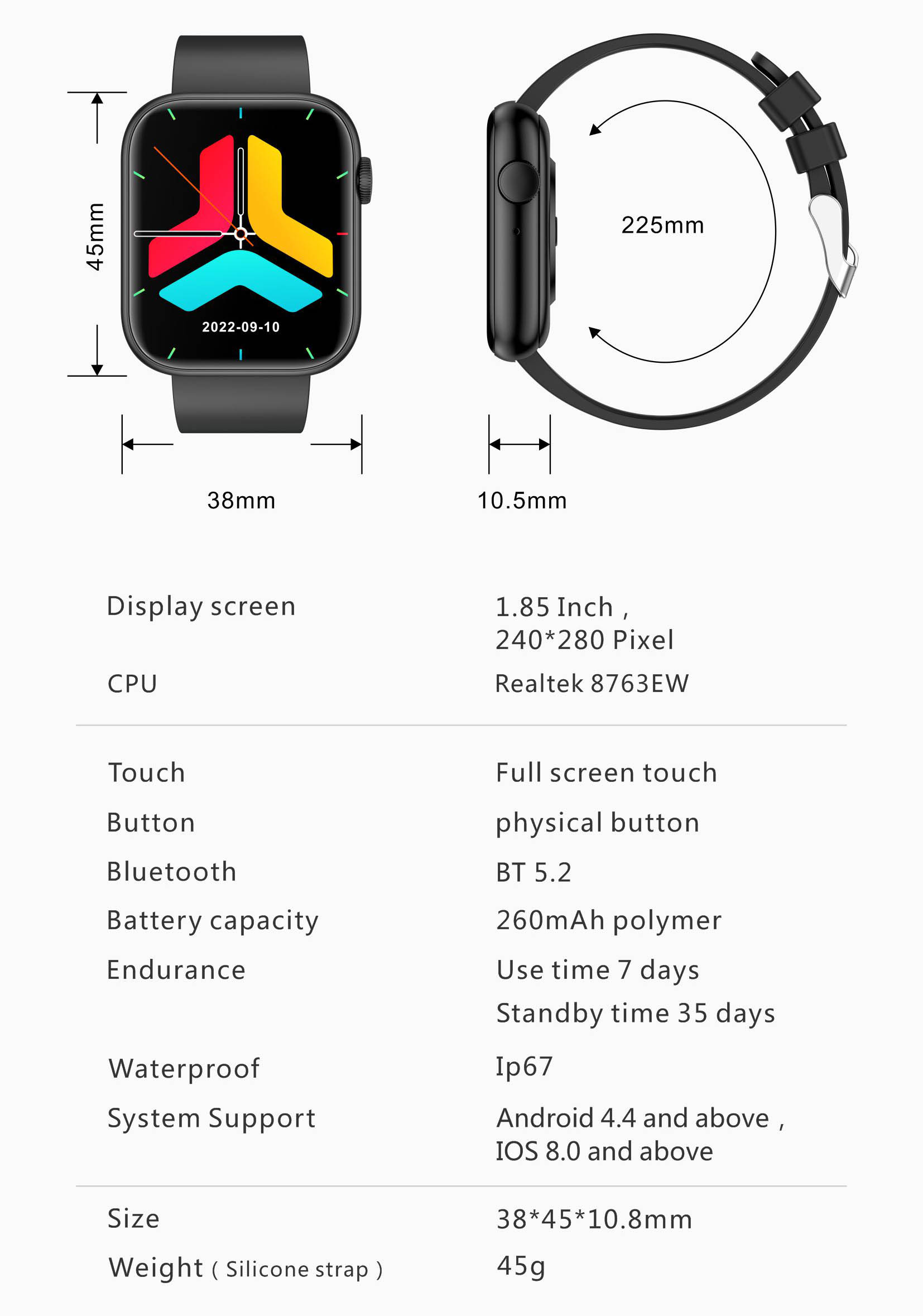 Featuring a 1.85-inch touchscreen and a 260 mAh battery, this watch offers smooth and long-lasting use. It is compatible with Android 4.4 and iOS 8.0 and later versions, for a connected experience on most smartphones.