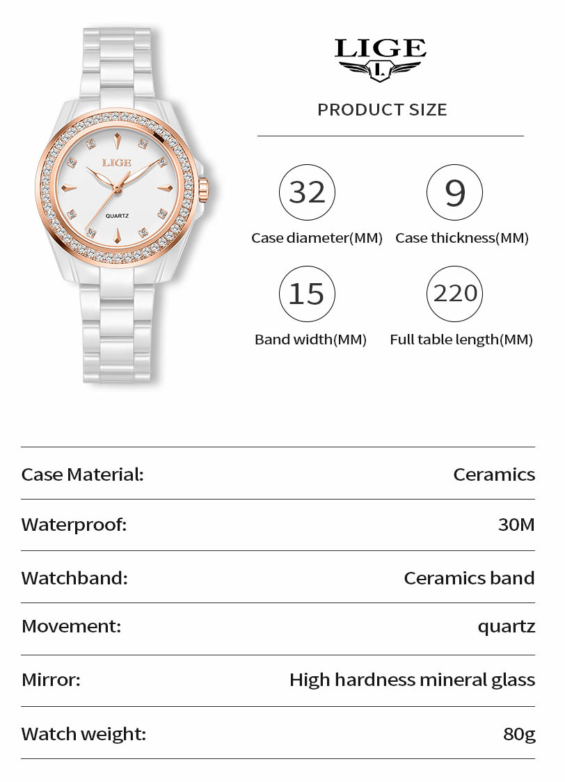 This model features a 32 mm diameter case with a thickness of 9 mm, ensuring an optimal balance between slimness and wrist presence. The ceramic bracelet is 15 mm wide with a total length of 220 mm, ensuring comfortable wear throughout the day. The watch is equipped with a reliable quartz movement, high-resistance mineral glass, and weighs only 80 g, contributing to a feeling of lightness and comfort.