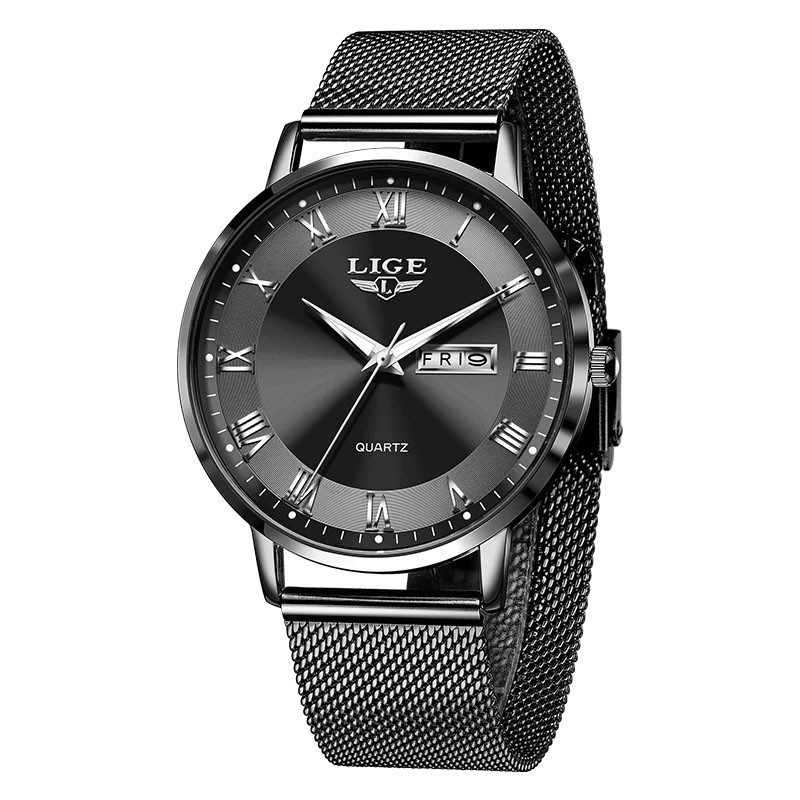 La correa de malla de acero inoxidable se ajusta fácilmente al tamaño de la muñeca para un confort adecuado. Su cierre asegura un soporte fiable durante todo el día.