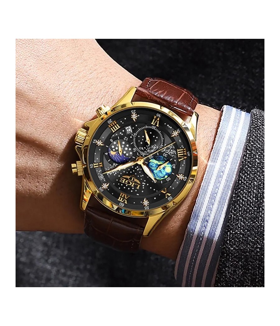 Este reloj integra un cronógrafo, una pantalla de 24 horas, las fases de la luna y un calendario automático.