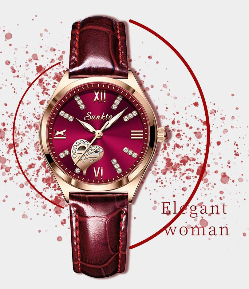 Alliant le classique et le moderne, le modèle SUNKTA Juliet présente un cadran en or rose, conférant à la montre de luxe femme pas chère une délicatesse et un luxe sans égal. Avec son cadran de couleur vin rouge et or rose, ces tonalités rendent la montre séduisante et raffinée.