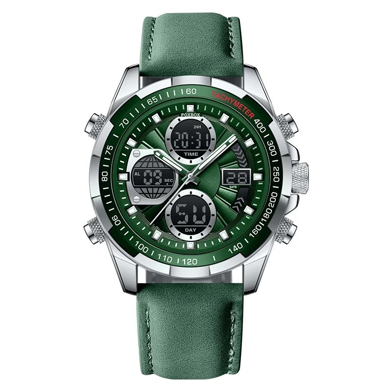 Le boîtier en alliage mesure 46 mm de diamètre pour une épaisseur de 16 mm, assurant une présence affirmée au poignet. Dotée d’un verre minéral renforcé, d’un mouvement électronique fiable et d’un bracelet en cuir confortable, elle offre également un affichage du calendrier et une étanchéité adaptée à un usage quotidien.
